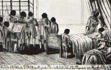 Name: Mozart auf dem Sterbebette Artist: Frohberger Year, Place: , Medium: Brush drawing Owner: Private collection, Munich Comments: "Friends and pupils performing the completed part of the Requiem"; Constanze and Karl on the bed, Wolfgang is in the cradle. There was no artist of this name. A variant of this picture, a reversed impression painting on glass, signed Haslinger Fecit.